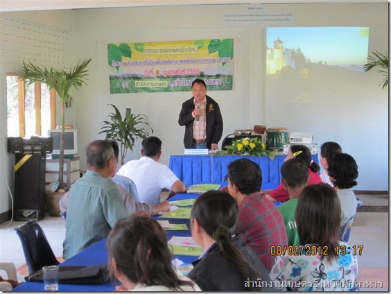 นายร่มไม้ นวลตา เกษตรจังหวัดมุกดาหาร ออกติดตามงานโครงการและให้ข้อคิด เป็นแนวทางการประกอบอาชีพเพื่อเพิ่มรายได้ให้มั่นคงแก่เกษตรกร ได้แก่ โครงการส่งเสริมการใช้ปุ๋ยลดต้นทุนการผลิตของเกษตรกร โครงการส่งเสริมการปลูกพืชเศรษฐกิจ เพิ่มรายได้และอื่นๆ ที่เสริมรายได้อย่างมั่นคง ให้แก่อาสาสมัครเกษตรหมู่บ้าน (อกม.) ในพื้นที่อำเภอดอนตาล อำเภอหนองสูง และ อำเภอหว้านใหญ่ เมื่อวันที่ ๘ กุมภาพันธ์ ๒๕๕๕